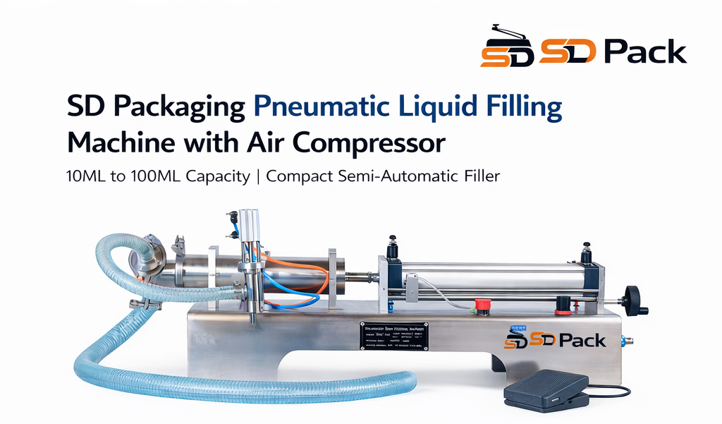 The SD Packaging Pneumatic Liquid Filling Machine 10 to 100ML with Air Compressor is a semi-automatic filler that has been carefully designed for industries dealing with low-volume, high-precision liquid filling requirements.