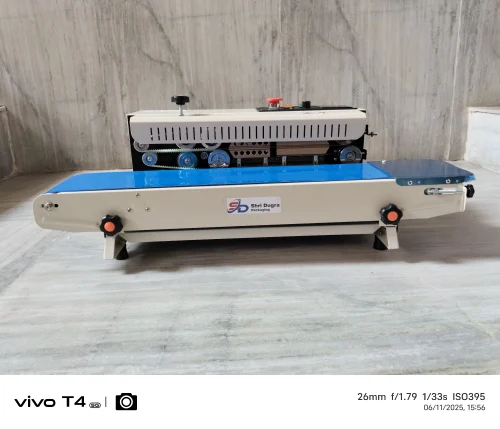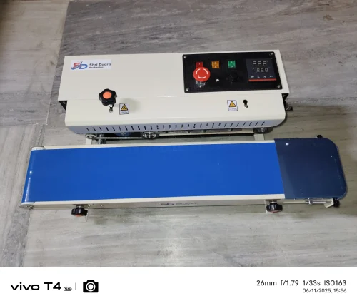 A continuous band sealer is a type of packaging machine used to seal plastic bags or pouches continuously, typically in food, pharmaceutical, or industrial packaging. It works by feeding the bags through a heated sealing area where two bands press together to form a strong, airtight seal. This machine is ideal for high-volume production as it allows for consistent, fast sealing with minimal downtime. The sealer can also be adjusted for different bag sizes and materials.
